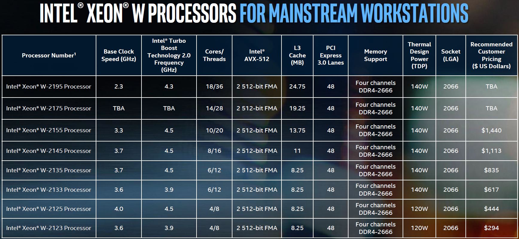 • Devis Intel Xeon W-2195 | 2443 | SKU | 18 | 2,3/4,3 TB2 | C422 | 29/8/2017 |